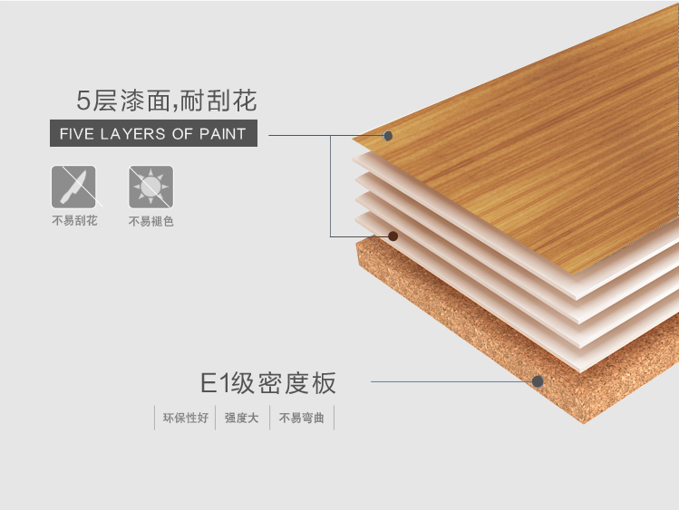 E1级密度板,5层漆面,耐刮花,不易褪色。