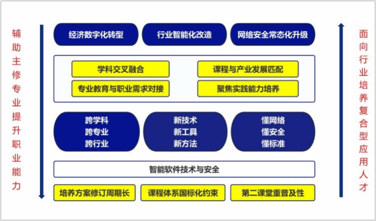 “智能软件技术与安全”微专业以“面向能力育人,面向产出育人,面向需求育人”为建设原则,面向企事业单位数字化对复合型人才的需求,在主修专业学习之外,围绕以Python语言的智能软件开发,行业认可的网络安全技术开设一组核心课程,旨在使学生具有“AI+主修专业”、“网络安全+主修专业”的交叉学科思维,在求学与就业的路上,具备一定的竞争能力。